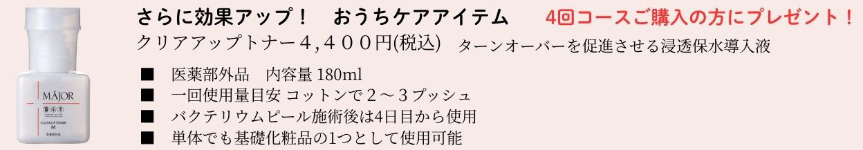 (お肌の負担をかけずに出来る肌再生のこと)短期集中トリートメントです。 ピーリングと違い、古い角質を強制的に剥がさずにターンオーバーを促進し、下から均一に古い角質を押し出し排出する短期集中型のケア方法です。 欧⽶⼈より繊細で敏感な⽇本⼈の肌向けに開発されているため、有効成分が肌の深部に浸透しやすくなっています。バクテリウムピールはリボーニングに使用するトナーが3種類あるため、お肌悩みに合わせて選んでいただくことができ、幅広いお悩みに対応できます。